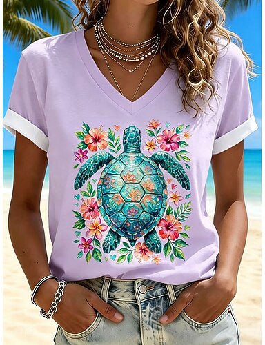 Naisten T-paita Painettu Kuvitettu Merikilpikonna Vintage Tyylikäs Klassinen Lyhythihainen V kaula-aukko Tavalliset topit Kausaliteetti Päivittäin Bile Sininen Valkoinen Punastuvan vaaleanpunainen