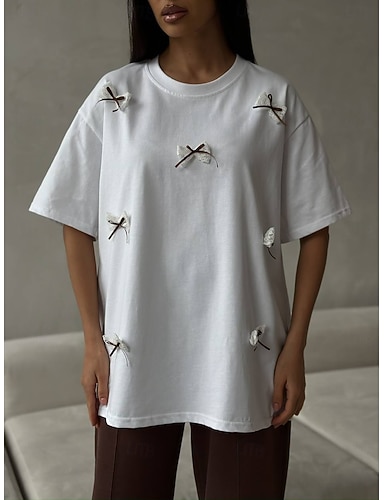 Womens 100% Puuvilla Tee 3D Applikaatiot Kaunis Tyylikäs Rento Lyhyt Hiha Pyöreä Kaula-aukko Säännölliset Paitat Päivittäinen Poismeno Valkoinen Kesä Kevät