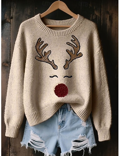 Joulu Naisten Poron Neule Pullover Rentoa Graafinen Ribattu Crew Neck Neulottu Printti Pitkähihainen Regular Päällysvaatteet Neulominen Ulkona Viikonloppu Khaki Syksy Talvi