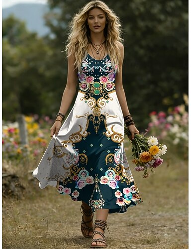 Naisten Midi-mekko Boho Rento Mekko Keinuva Mekko Kesämekko Mekko Vintage Ranta Regular Fit Kukallinen Graafinen Hihaton Pyöreä kaula-auko Sininen Punainen Vihreä Kesä Kevät
