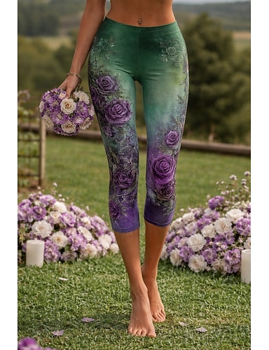 Naisten Leggingsit Loma Muoti Katutyyli Capris Korka vyötärö Kukka Kuvitettu Mukavuus Pehmeä Mukava Elastinen Päivittäin ulko- Loma Sininen Ruskea Apila Kesä Kevät Syksy Tyköistuva