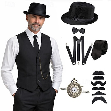 Setti Vintage Retro / vintage Möly 20s Tarvikesarja Fedora Hat lisävarusteiden kanssa Suuri Gatsby Herrasmies Halloween Naamiaispuku Miesten 5 kpl Halloween Karnevaali Juhla Naamiaiset Aikuiset Hattu