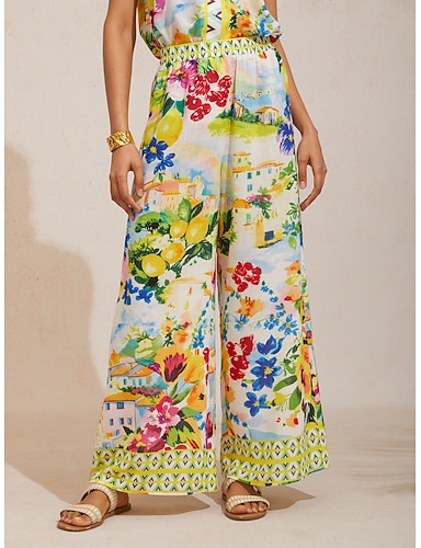 Sitruspuutarhan tyyliset, ilmavat ja leveälahkeiset lomahousut
