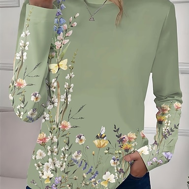 Naisten Paita Pusero Tilkkutäkki Napit Painettu Kukka Kuvitettu Vintage Tyylikäs Vapaa-aika Pitkähihainen Paitapuserokaula-aukko Pitkät topit Kausaliteetti Päivittäin Sininen Rubiini Purppura Apila