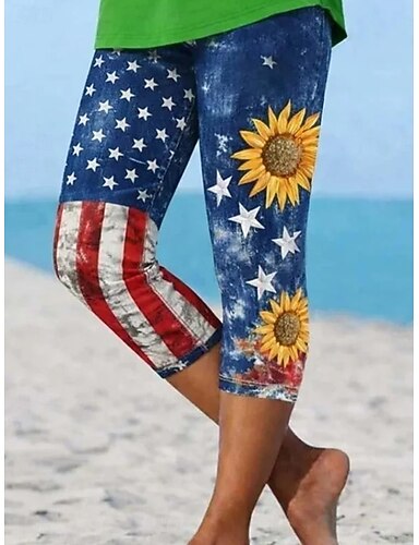 Amerikan itsenäisyyspäivä naisten caprit leggingsit tyylikkäät joustavat pohjepituiset keskivyötäröiset housut graafinen lippukuvio mukavuus joustava ulko- loma katu sininen valkoinen tummansininen