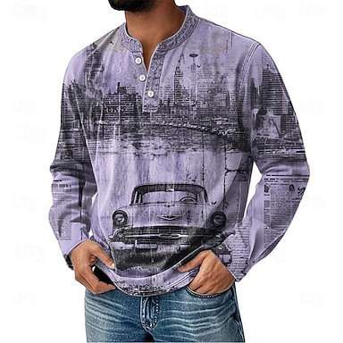 Miesten Kuvitettu Auto Henley-paita Pitkähihainen Vintage Muoti söpö tyyli Kausaliteetti Pyhäpäivä Bile 봄 & Syksy Läpi vuodenaikojen Sininen Harmaa Purppura Khaki Henley Henley T-paita