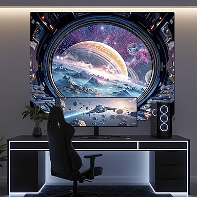 avaruusalus ikkunanäkymä ulkoavaruus galaksi maailmankaikkeus rengasmainen planeetta sumu tähdet jäinen kuu maisema scifi ikkuna seinävaate pelihuoneen sisustus makuuhuone toimisto tausta