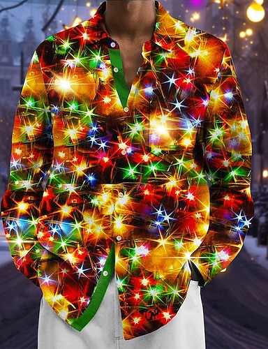 Christmas Miesten Kimalteleva glitteri Jouluvalot Paita Button Up paita Pitkähihainen Muoti rento Pyhäpäivä Kevät Syksy Sänkyjen avaus 3D-tulostus Edessä yksi tasku Pellava kuin paita Oranssi Apila
