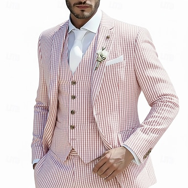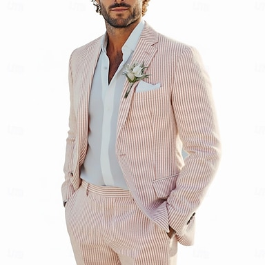 Miesten Seersucker-puvut Ranta häät Keväthäät Punastuvan vaaleanpunainen Taivaan sininen Kevät kesä Puku Pystykäänne Päivittäin Vapaa-aika Raidoitettu Tyköistuva 2-osainen setti Yksirivinen yksi nappi