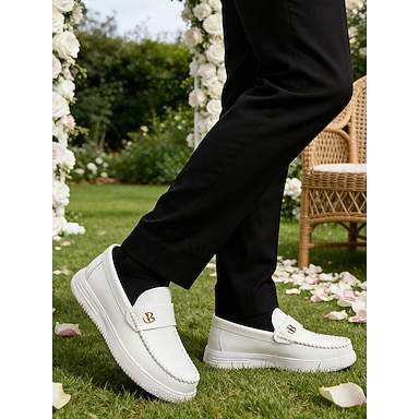 Miesten valkoiset slip-on-lenkkarit logolla – tyylikkäät keinonahkaiset kengät häävieraille, jotka etsivät mukavuutta ja tyyliä