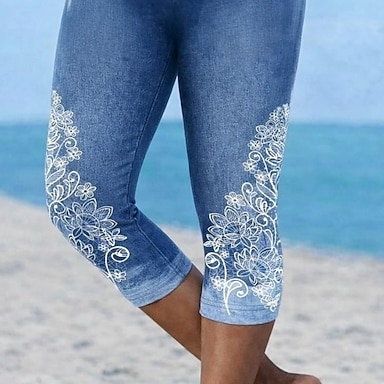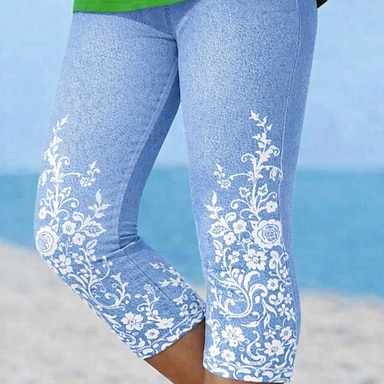 Naisten capri-leggingsit 3D-printti chinot leggingsit lomalle vintage rento pohje-pituus korkea vyötärö kukkakuviolla mukautuva pehmeä mukava joustava ulkoilma loma katu sininen kesä kapea istuvuus