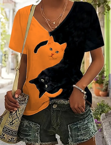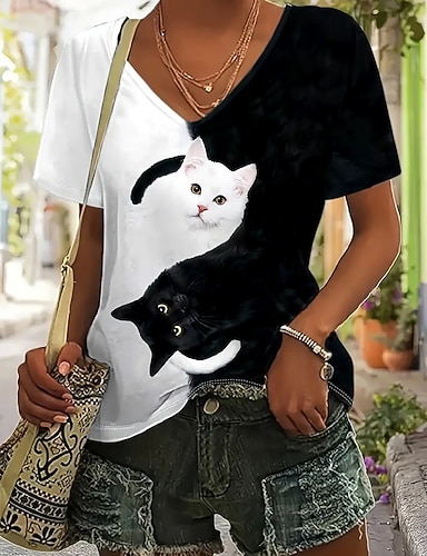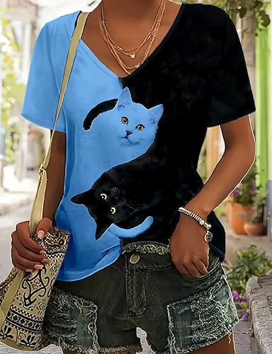 Naisten bluusimainen pellavamainen hengittävä kevyt tunika V-kaula-aukko pitkähiha boheemi rento kesähuppari graafinen eläinkuva kissa vintage trooppinen tavallinen huppari päivittäinen käyttö