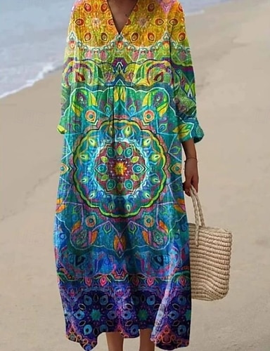 Naisten bluusimainen pellavamainen hengittävä kevyt tunika V-kaula-aukko pitkähiha boheemi rento graafinen paisley vintage trooppinen tavallinen huppari päivittäinen käyttö printti punainen sininen