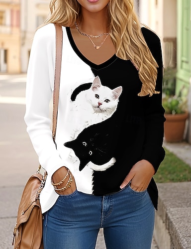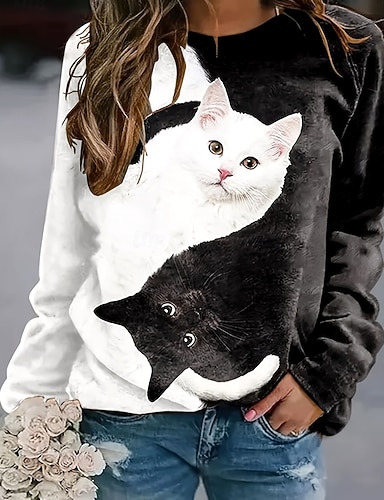 Naisten T-paita pyöreä pääntie pitkät hihat tunika graafinen kissa kirjain vintage tyylikäs klassinen pyöreä pääntie säännölliset hupparit päivittäinen viikonloppu printti valkoinen musta musta