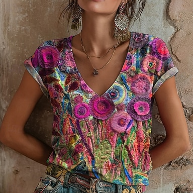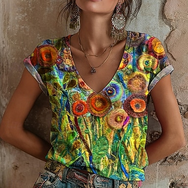 Naisten T-paita Painettu Kukka Graffiti Böömi Vintage Vapaa-aika Lyhythihainen V kaula-aukko Tavalliset topit Päivittäin Sateenkaari Kesä Kevät
