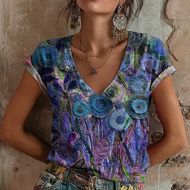 Naisten T-paita Painettu Kukka Kuvitettu Graffiti Böömi Vintage Vapaa-aika Lyhythihainen V kaula-aukko Tavalliset topit Päivittäin Sininen Taivaan sininen Purppura Oranssi Ruskea Kesä Kevät
