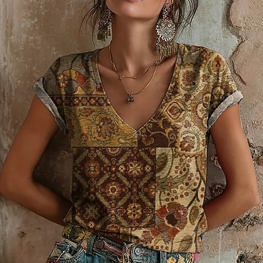 Naisten T-paita Painettu Ombre Kuvitettu Graffiti Böömi Vintage Vapaa-aika Lyhythihainen V kaula-aukko Tavalliset topit Päivittäin Apila Kesä Kevät