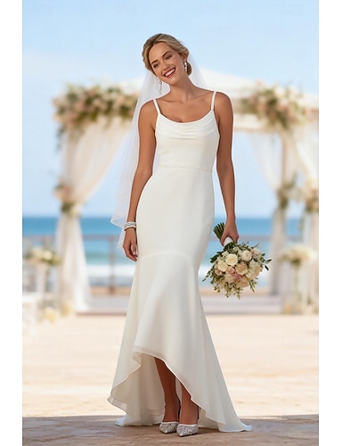 Trumpetti merenneito Epäsymmetrinen Valkoinen mekko Häämekot Morsiuspuvut Hääpuku Valkoiset pikkumekot Hihaton Laskostettu kaulus valmistuminen Syntymäpäivä kanssa Laskokset Solid Color