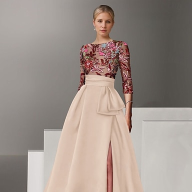 A-linja Kokopitkä Iltapuku Tanssiaispuku hameen päällä Muodollinen mekko Tyylikäs Silkkinen Pitkähihainen Tiukka pyöreä kaula-aukko Häät Muodollinen Samppanja morsiamen äiti -mekko Satiini kanssa