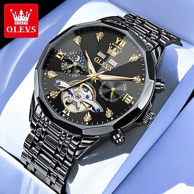 olevs 6621 miesten rannekello alkuperäinen merkki automaattinen mekaaninen liikekello vedenpitävä valoisa ikuinen kalenteri kuun vaihe ruostumattomasta teräksestä valmistetut kellot