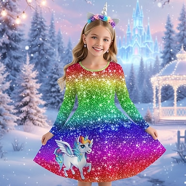 Tyttöjen 3D Kuvitettu Sateenkaari Yksisarvinen Mekko Pitkähihainen 3D-tulostus Kevät Syksy Suoritus Loma Juhla Vapaa-aika Prinsessa Kaunis Lapset 4-12 vuotta Rento mekko A linjainen mekko