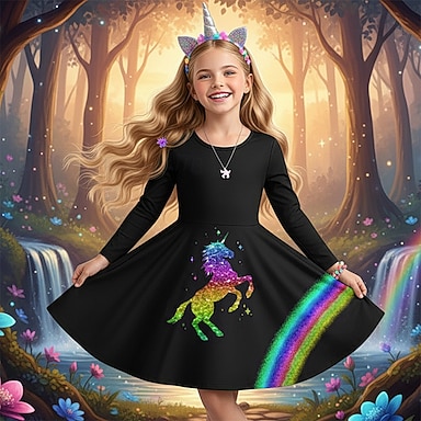 Tyttöjen 3D Kuvitettu Yksisarvinen Mekko Pitkähihainen 3D-tulostus Kesä Kevät Syksy Loma Urheilu ja ulkoilu Päivittäin söpö tyyli Vapaa-aika Kaunis Lapset 3-12 vuotta Rento mekko A linjainen mekko