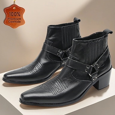 Miesten aidosta nahasta valmistetut mustat valjaskengät teräväkärkisellä ja lohkokorolla, lehmännahkaiset moottoripyörän cowboy-saappaat lavalle, juhliin ja rock-tyylisiin asuihin.