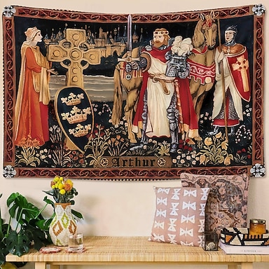 kuningas Arthur keskiaikainen ritari seinävaate Arthur-teksti kelttiläinen risti ja kuninkaallinen kilpi vintage-legenda kangas roikkuu kirjastomiehen luolaolohuoneen sisustukseen