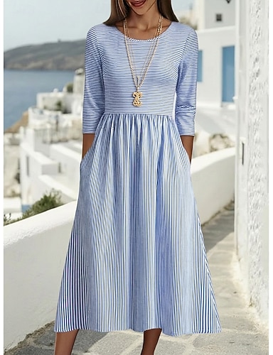 Naisten Midimekko Rento mekko Puuvillamekko A linjainen mekko Muoti Moderni Päivittäin Loma Pyhäpäivä Normaali Raidoitettu 3/4 hiha Tiukka pyöreä kaula-aukko Vaalean sininen Kesä Kevät