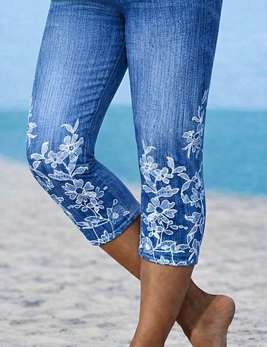 Naisten capri-leggingsit 3D-printti chinot leggingsit lomalle vintage rento pohje-pituus korkea vyötärö kukkakuviolla mukautuva pehmeä mukava joustava ulkoilma loma katu sininen kesä kapea istuvuus