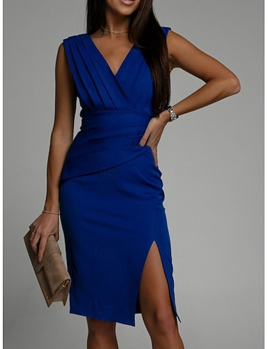 Naisten Midimekko Kotelomekko Tyylikäs Iltajuhlat Häävieras Rypytetty Jaettu Yhtenäinen väri Hihaton V kaula-aukko Laivaston sininen