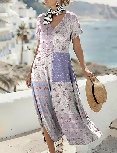 Naisten Maksimekko Kesämekko Tpaitamekko A linjainen mekko Loma Vapaa-aika Hiekkaranta Bile Loose Fit Kukka Kuvitettu Tribaali Lyhythihainen V kaula-aukko Punastuvan vaaleanpunainen Purppura Oranssi