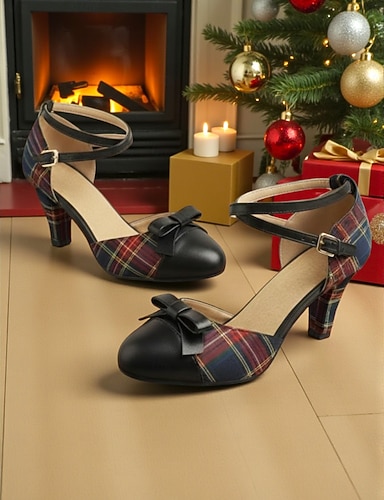 naisten mustavalkoiset lohkokorkopumput rusetilla – vintage-vaikutteiset matalakorkoiset kengät toimistoon, arkeen ja muodikkaaseen tilaisuuteen