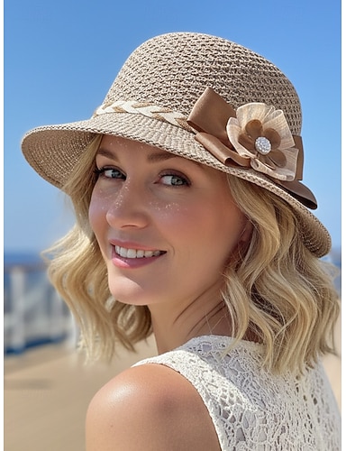 Naisten elegantti leveälierinen kukkakuvioinen olkihattu rusetilla ja helmikoristeilla, täydellinen kesän puutarhajuhliin, ulkoilmatapahtumiin ja häihin