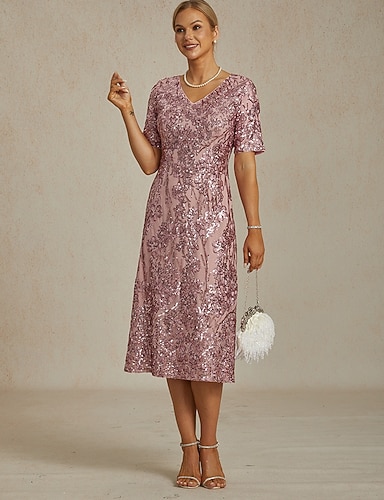 Naisten Midimekko Väljä mekko Tyylikäs Juhla Juhla Häät Paljetti Kirjailtu Kimallus Normaali Kukka Lyhythihainen V kaula-aukko Vaaleanpunainen
