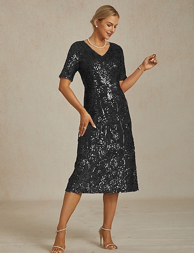 Naisten Midimekko Väljä mekko Tyylikäs Juhla Juhla Häät Paljetti Kirjailtu Kimallus Normaali Kukka Lyhythihainen V kaula-aukko Musta