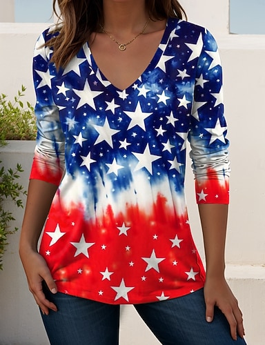 Itsenäisyyspäivä Patriottinen Naisten T-paita Printti Graafinen Amerikkalainen Lippu Vintage Tyylikäs Vapaa-ajan Pitkähihainen V-kaula-aukko Normaali Yksityiskohdat Päivittäin Viikonloppu Sininen