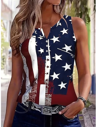 Itsenäisyyspäivä Patriottinaisten T-paita Lippu Tyylikäs Klassinen Hihaton V-neule Syvennys Säännölliset Huiput Päivittäiset Napit Painatus Sininen KesäKevät