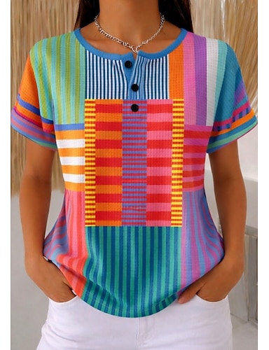 Naisten Waffle Rakennettu Neule Paidan T-paita Väri Blokki Grafiikka Geometria Tyylikäs Klassinen Lyhythihainen Pyöreä kaula Regular Paidan Päivittäinen Urheilu Musta ja Valkoinen Oranssi Sateenkaari