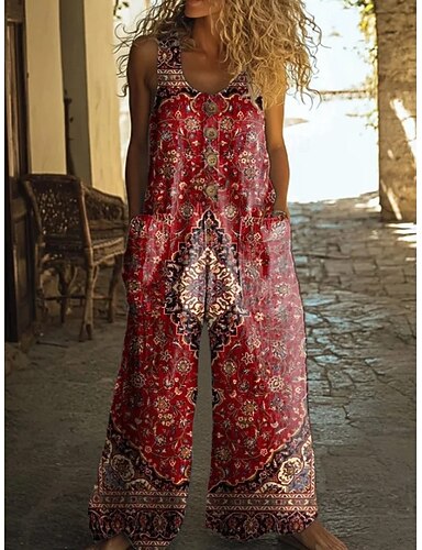 Naisten overall aktiivinen pellava-tyyppinen kukkakuva olkaimettomana leveät lahkeet pyöreä kaula-aukko päällekkäin päivittäinen loma löysä istuvuus sininen punainen oranssi kesä