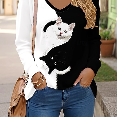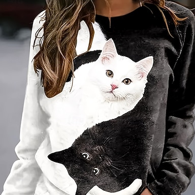 Naisten Pullover-huppari Tilkkutäkki Painettu Kuvitettu Eläin Kissa Lämmin Aktiivinen Vintage Pitkähihainen Tiukka pyöreä kaula-aukko Tavalliset topit Kausaliteetti Katu Arkikäyttö Khaki Harmaa Kevät