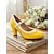 naisten keltaiset vintage-vaikutteiset korkokengät, joissa on brogue-yksityiskohtia, paksu kantapää ja slip-on muotoilu, jotka sopivat täydellisesti työvaatteisiin ja erikoistilaisuuksiin