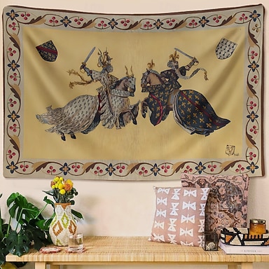 keskiaikainen ritari turnajaisissa kaksi soturia hevosilla kuninkaallinen fleur-de-lis-vaakuna seinävaate vintage goottilainen heraldiikka taide olohuoneeseen makuuhuoneeseen kodinsisustus