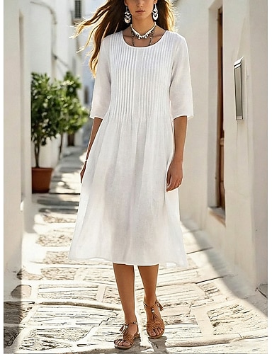 Naisten Midimekko Keinopuuvillainen pellava Väljä mekko Valkoinen mekko Rento mekko Perus Vapaa-aika Päivittäin ulko- Loose Fit Tavallinen Lyhythihainen Tiukka pyöreä kaula-aukko Valkoinen Purppura