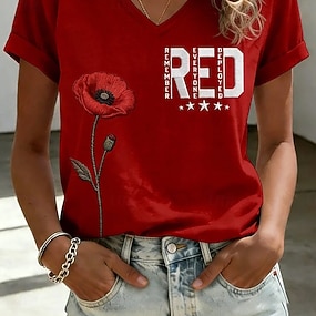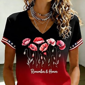 Jour de l'Indépendance Américaine Femmes T-shirt Imprimé A Ombre Fleuri Graphique Élégant Classique Occasionnel Manche Courte Col en V Hauts Réguliers Occasionnel Quotidien Noir et rouge Rouge Ét