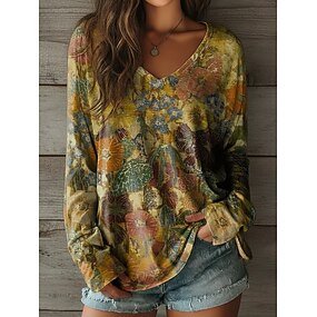 Femmes T-shirt Imprimé Fleuri Graphique ancien Classique Occasionnel manche longue Col en V Hauts Réguliers Quotidien Bleu Violet Vert Printemps Automne