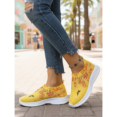 Baskets Flyknit jaunes à imprimé papillon pour femme - chaussures de marche à enfiler ornées de strass scintillants, idéales pour les voyages décontractés, les sorties en plein air et le confort au quotidien