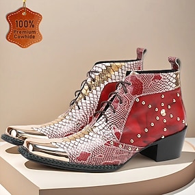 Bottines rouges pour homme à imprimé serpent – cuir de qualité supérieure avec détails cloutés, parfaites pour les fêtes de Noël et les réunions de fin d'année.