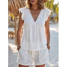 Femmes Débardeur Hauts Élégants Hauts en dentelle Texturé A Volants Couleur Unie Mode Élégant Classique Sans manches Col en V Hauts Réguliers Quotidien Sortir Week-end Noir Blanche Marron Bleu clair