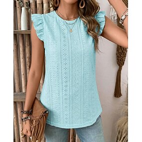 Femmes T-shirts à broderie ajourée A Volants Découpé Dos attaché Couleur Unie Élégant ancien Occasionnel Manche Courte Mancheron Col ras du cou Col rond Hauts Réguliers Occasionnel Quotidien Sortir